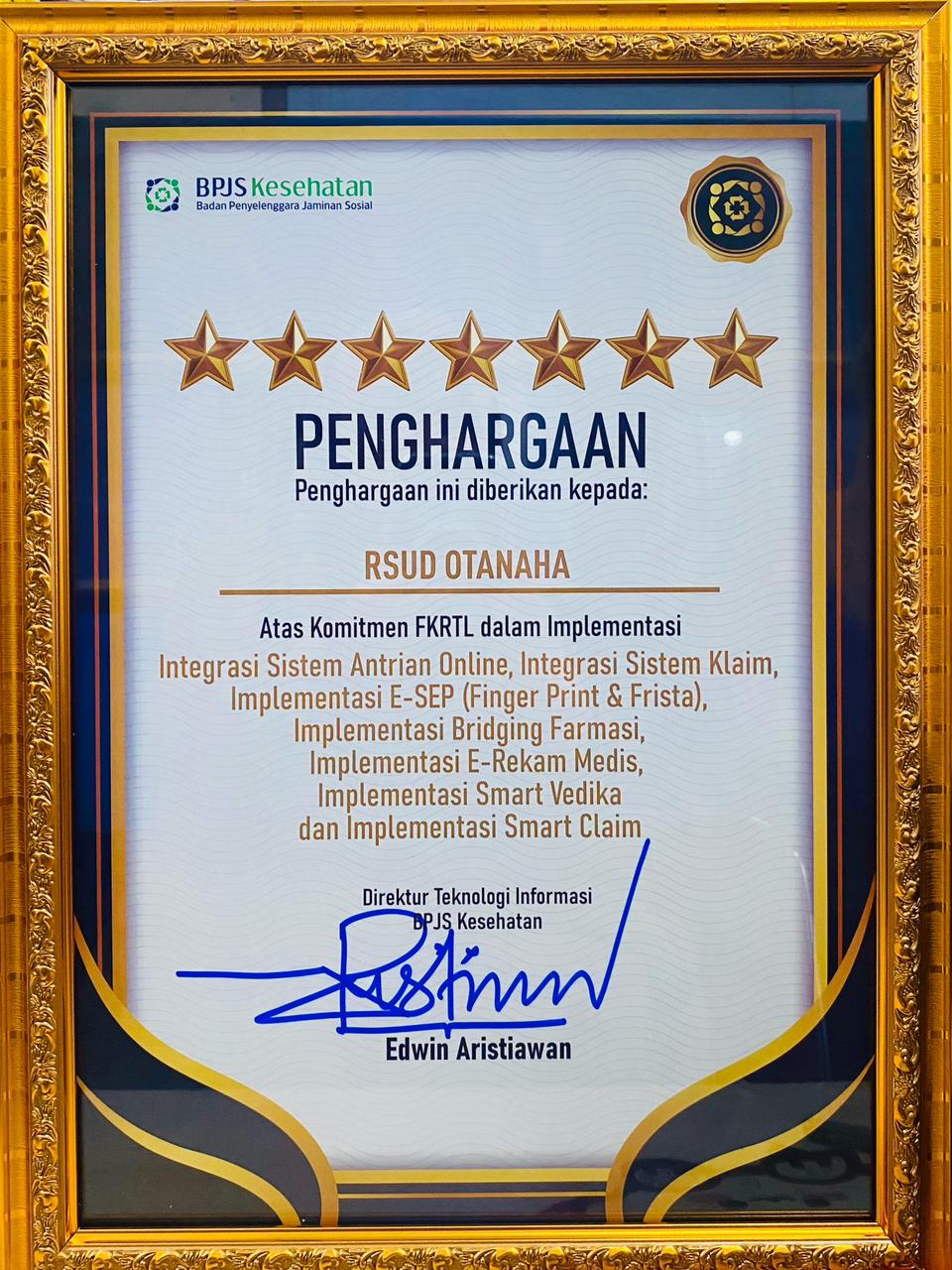 Salah satu sorotan utama dalam agenda transformasi ini adalah keberhasilan RSUD Otanaha yang baru-baru ini meraih penghargaan bergengsi "Bintang 7" dari BPJS Kesehatan. Penghargaan tersebut diberikan sebagai bentuk pengakuan atas komitmen RSUD Otanaha dalam mengintegrasikan tujuh pilar sistem digital secara penuh, termasuk antrean online, E-Rekam Medis, hingga sistem klaim otomatis (Smart Claim).