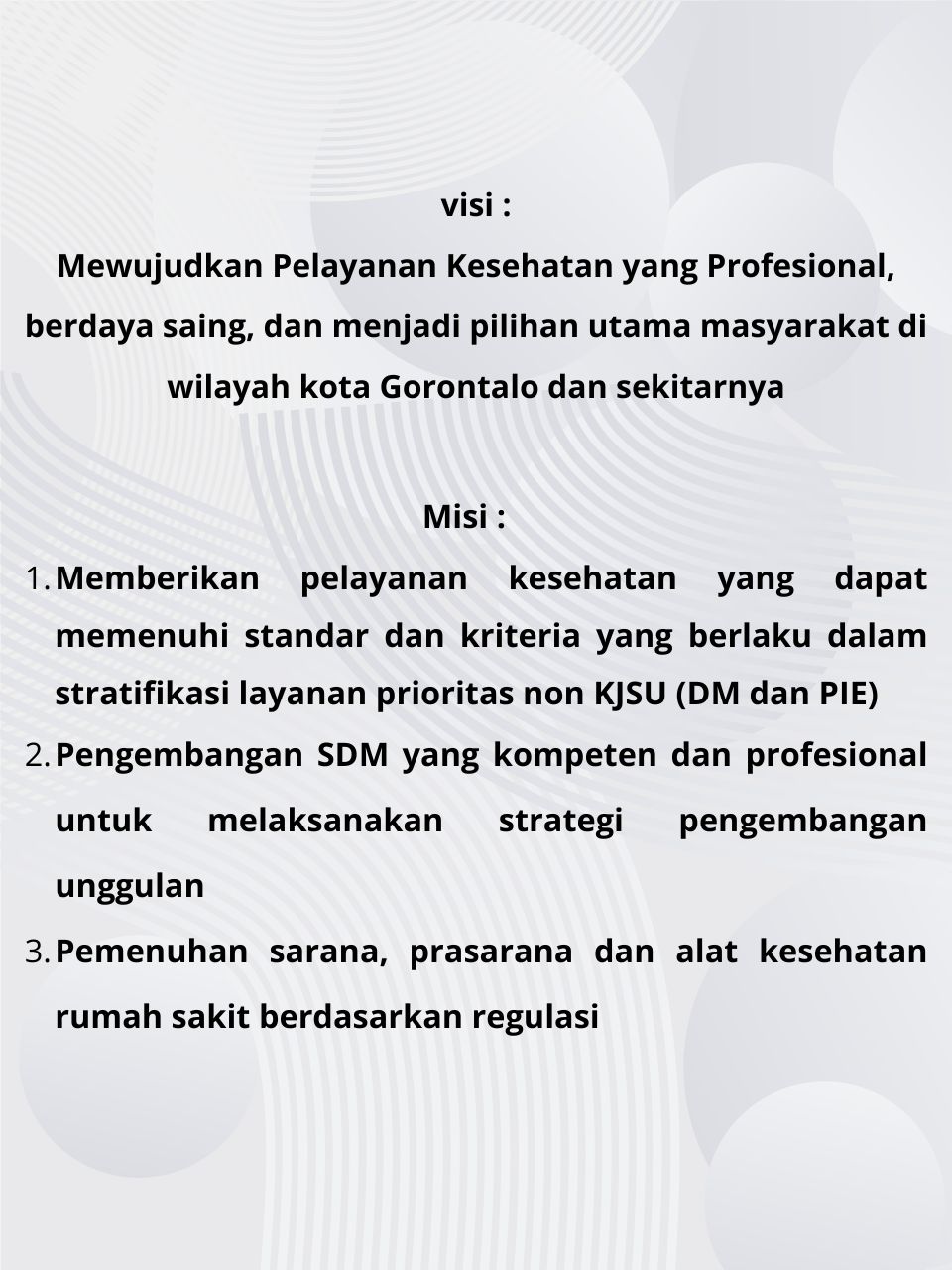 Menanggapi kondisi tingkat pelayanan saat ini dan berbagai dinamika perubahan yang terjadi, RSUD Otanaha Kota Gorontalo berkomitmen untuk mencapai tingkat pelayanan yang lebih optimal, atau 'Prima'. Komitmen ini diformulasikan ke dalam Visi dan Misi, sebagai berikut:"